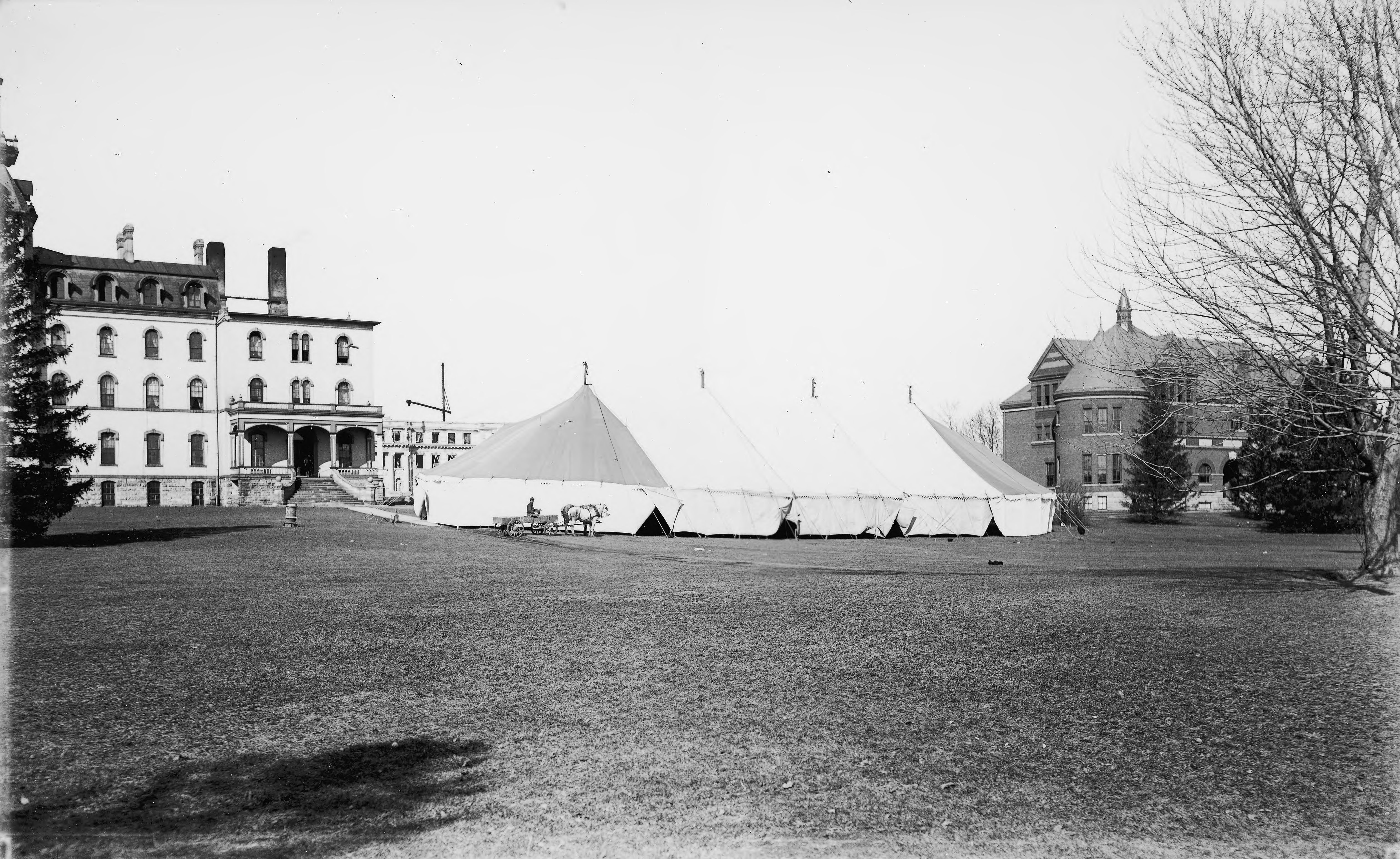 - A large tent is pictured in the center of this photograph. Old Main is to the left of the tent and Morrill Hall is on the right. Marston Hall (under construction) can be seen in the distance. A man in a horse-drawn wagon is in front of the tent.