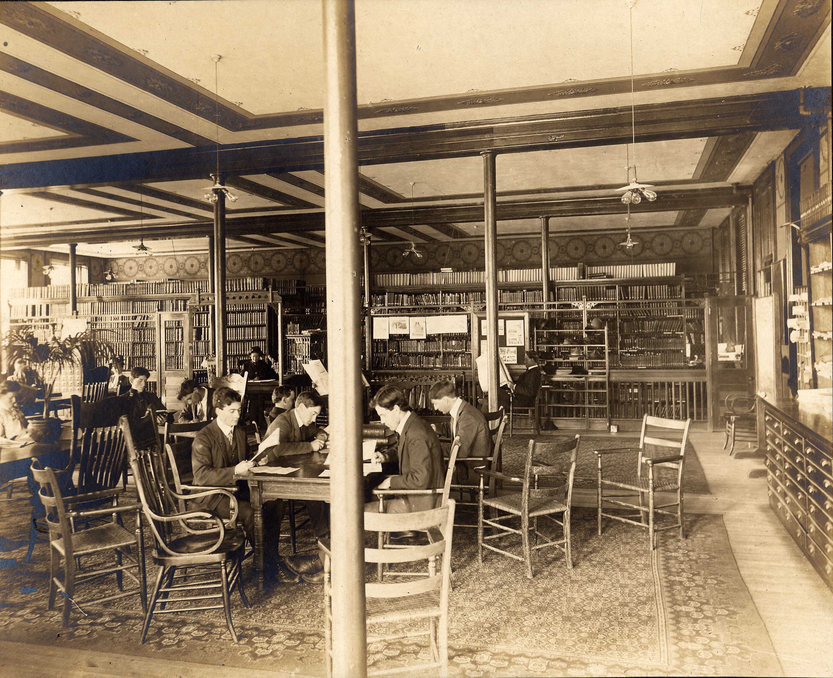 - People sit at tables throughout the library reading newspapers and books.